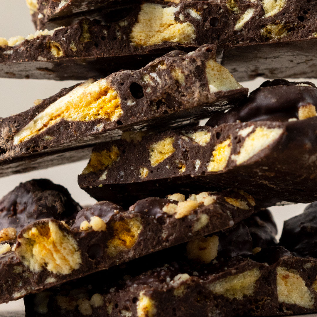 This dark chocolate honeycomb bark with a cookie crumble is handcrafted for those who crave the perfect harmony of deep cocoa intensity, airy honeycomb crispness, and the nostalgic sweetness of freshly baked cookies.